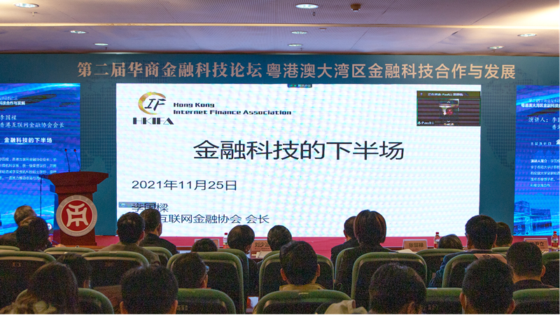 第四场主旨演讲由香港互联网金融协会李国樑会长分享,演讲主题为“金融科技的下半场”。李国樑先生首先结合生动案例,介绍了金融和科技如何互相促进发展并不断推动社会变革的历程,指出疫情前的金融科技发展经历了互联网金融波折的阶段和金融科技繁荣的阶段。随后提出了金融科技上半场和下半场转换中间面临的全球困境。最后分享了自己对于金融科技未来的一些思考,他认为金融科技下半场将是一个各种金融业态整合发展的阶段,未来粤港澳大湾区发展金融科技可以聚焦于推进金融基础设施建设,打通内地、香港、澳门三种不同制度框架之间的壁垒。