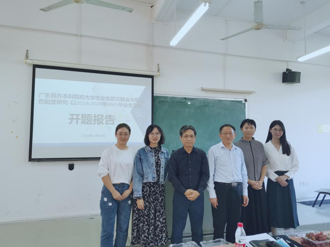 2020年11月24日下午3:00,经济管理学院公共管理系在厚德楼C305召开2020年度广东省普通高校青年创新人才项目“广东民办本科院校大学毕业生初次就业与专业匹配度研究-以2018-2020年HSXY毕业生为例”(编号:2020WQNCX118)开题报告会。广东财经大学华商学院公共管理系主任王业兴教授、于唤洲副教授、广东财经大学顾文静教授参加了本次会议并担任指导专家。