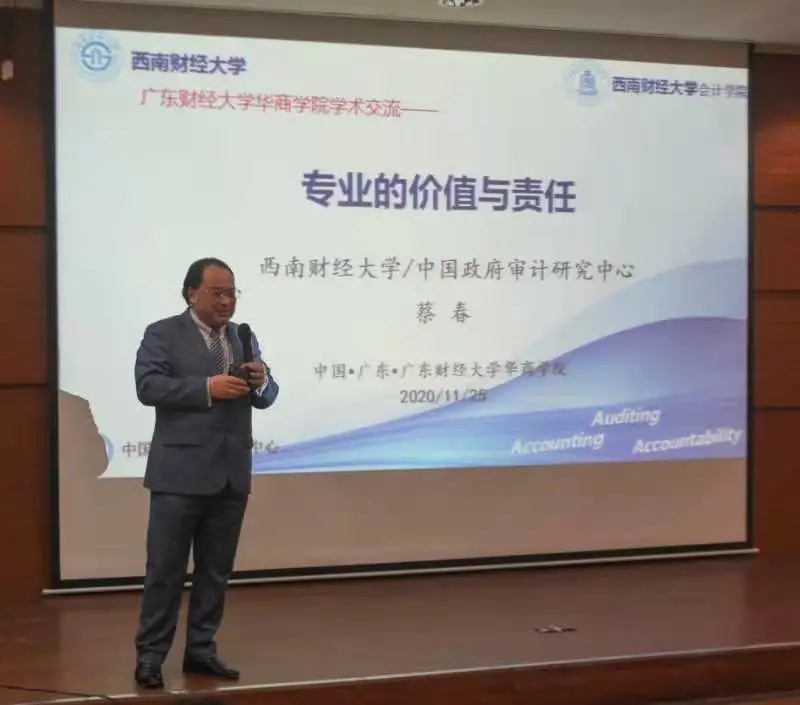 2020年11月25日下午3点30分,我国著名会计学者、西南财经大学博士生导师蔡春教授在我校图书馆学术报告厅开展以“专业的价值与责任”为主题的讲座。广东财经大学华商学院副校长兼会计学院院长陈美华教授、会计学院副院长巴雅尔及师生代表约200人参加了讲座。