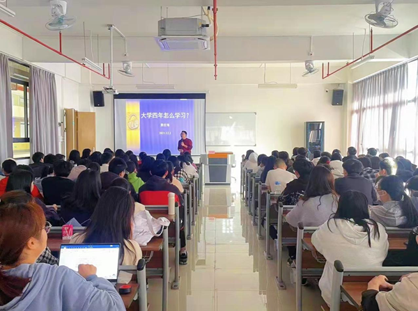 袁主任启示同学们,在大学的学习中,要从“我是谁?学什么?怎么学?”这三方面思考。对于“我是谁”,袁主任建议同学们正确认识自己,用全面的、发展的眼光看待自己。对于“学什么”,袁主任指出四个方向:第一,学好一门专业课知识,这是必备的社会生存技能;第二,培养两项爱好,这是提升生活质量的需要;第三,交三个朋友,这是谋生就业的需要;第四,拥有四段有意义的经历,充实大学生活。对于“怎么学”袁主任从学业、兴趣爱好、人际交往等方面给出了实用性建议。
