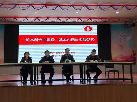 广东技术师范大学向凯教授以“一流本科专业建设:基本内涵与实践路径”为主题,从三个方面为全体教师作分享。首先,向教授从实施一流本科专业建设的政策背景与文件解读出发,提出了“建金专、建金课、建高地”三大核心任务;其次,向教授就一流本科专业内涵,从高校层面和专业层面进行了非常详细地剖析解释,并就一流本科专业的实践路径从“目标规格、师资队伍、课程体系、条件保障、质量评价”五大要素给出了具体的建议。最后向教授指出,一流本科专业建设应当依据不同学校办学类型和人才培养目标,适应经济社会发展,构建具有学校特色的培养模式和教学范式。