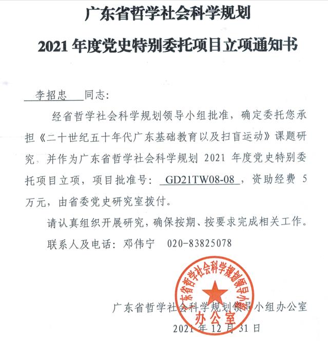 2022年1月12日,广东省哲学社会科学规划领导小组办公室公布了省社科规划2021年度党史特别委托项目立项名单,管理学院李招忠教授申报的《二十世纪五十年代广东基础教育以及扫盲运动》项目获批立项,省委党史研究室资助金额5万元。