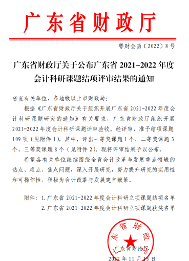 2022年11月15日,广东省财政厅公布了2021-2022年度会计科研课题结项评审结果,本次会计科研课题共有109个通过验收,广州华商学院课题立项共4个,课题结项通过率为100%。