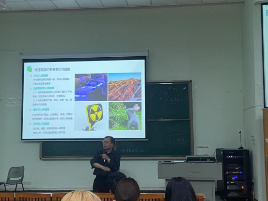 秦学教授先从健康的概念出发,阐述了各种环境变化与健康的关系,包括饮水土壤,微量元素等等。他再将环境与健康结合起来,让同学们意识到环境的重要性,明白了破坏环境也是在损害人类的健康,引发共鸣。