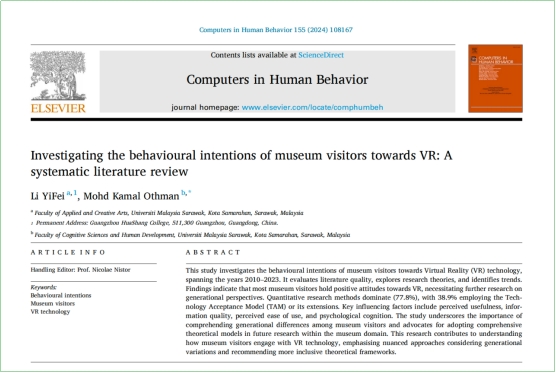 近日,创意与设计学院教师李奕霏以第一作者身份,在《Computers in Human Behavior》期刊发表《Investigating the behavioural intentions of museum visitors towards VR: A systematic literature review(博物馆游客对VR技术的行为意向:系统性文献综述)》论文。该期刊影响因子为9.9(Rank in psychology, experimental 3/99),五年影响因子10.2,属于中科院分区、SSCI一区,排名前5%的top期刊。