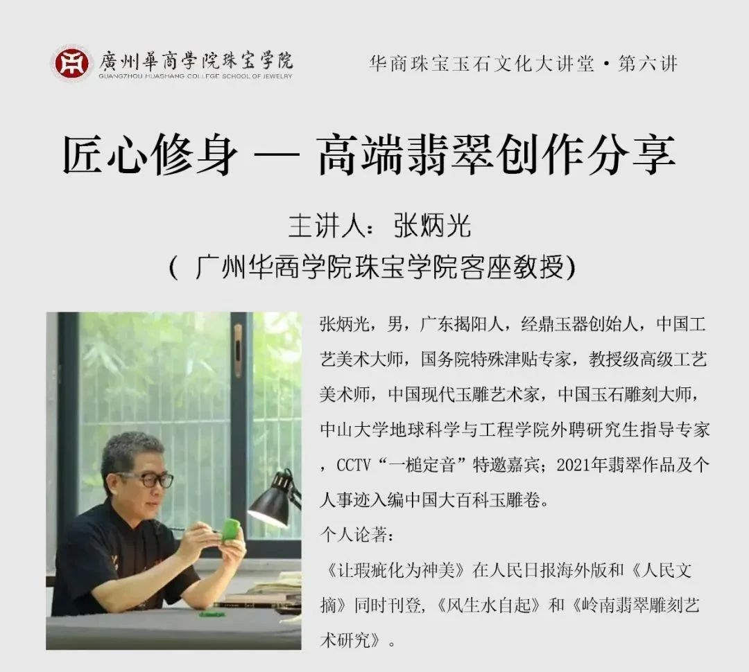 2024年10月18日,广州华商学院珠宝学院“华商珠宝玉石大讲堂”第六讲开讲,我们有幸邀请到了中国工艺美术大师、高级工艺美术师、中国玉石雕刻大师张炳光先生,先生做了题为《匠心修身---高端翡翠创作》的精彩演讲。张炳光是华商珠宝学院的客座教授,张大师的经鼎玉器公司是华商学院珠宝学院大学生产教融合校外实践教学基地。