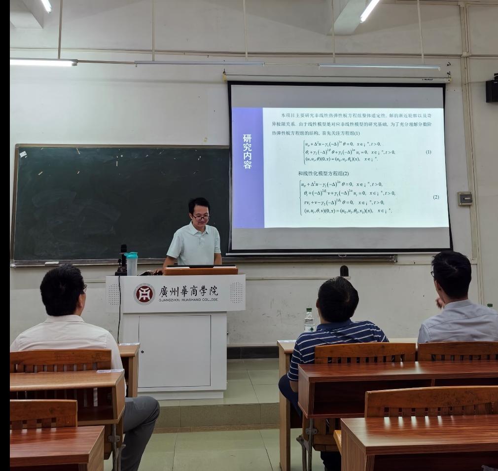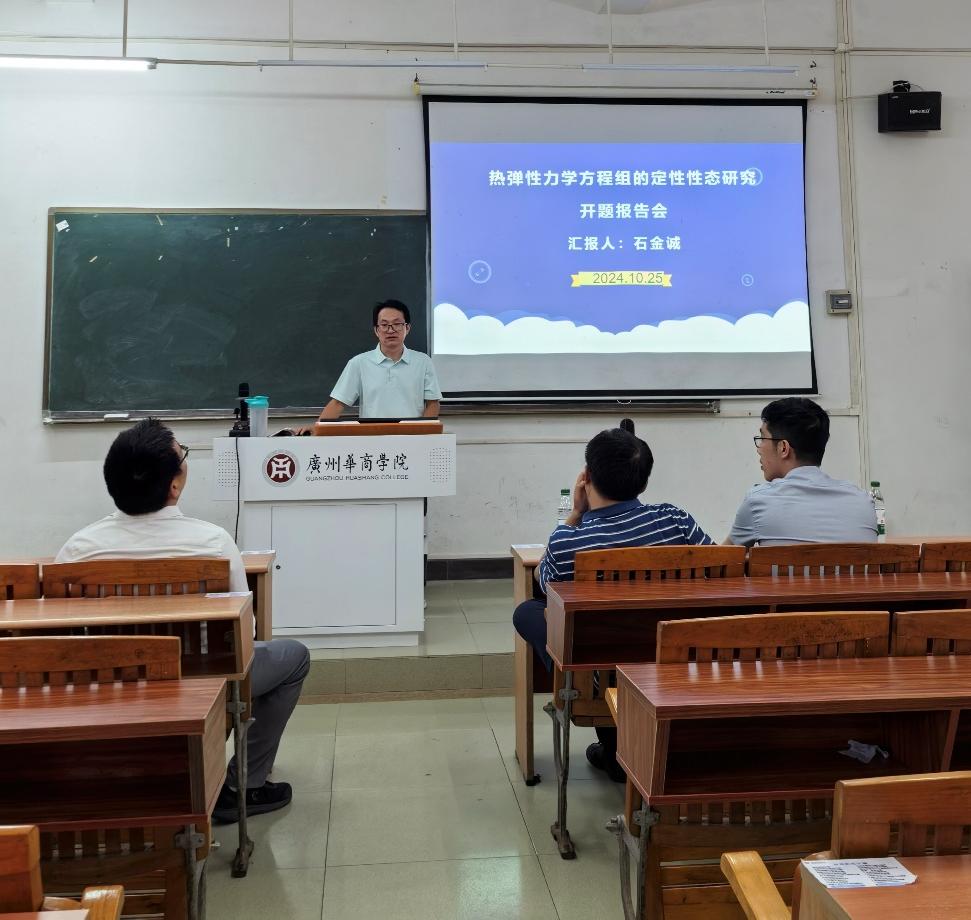评议专家包括广东金融学院刘炎教授、广州大学陈文辉教授和我校李远飞教授。参与人员除三位评议专家外,还有项目负责人石金诚和项目组成员。会议伊始,项目负责人石金诚首先对项目的选题背景、研究目的、研究内容、研究方法、预期成果及研究计划等方面进行了详细汇报。他强调,热弹性力学是研究弹性物体在温度影响下应力与应变如何变化的一门学科,具有重要的学术价值和实际意义。本项目将深入研究热弹性力学方程组的定性性态,包括解的存在性、稳定性、长时间性态等,以期为相关领域的理论研究和实际应用提供有力支持。