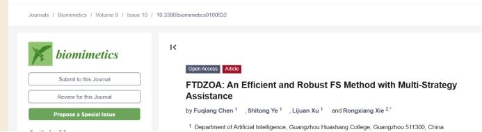 近日,人工智能学院教师陈富强以第一作者身份在《Biomimetics》期刊发表了题为“FTDZOA: An Efficient and Robust FS Method with Multi-Strategy Assistance”的论文。《Biomimetics》是一本专注于仿生学(Biomimetics)研究的学术期刊。通过模仿自然界中生物行为、动作、功能、机制和过程,来创新和发展新的多学科间的工程算法。期刊的研究方向涵盖计算机科学,工程学,医学等多个领域。该期刊属于SCIE检索期刊,是JCR Q1分区,中科院三区。