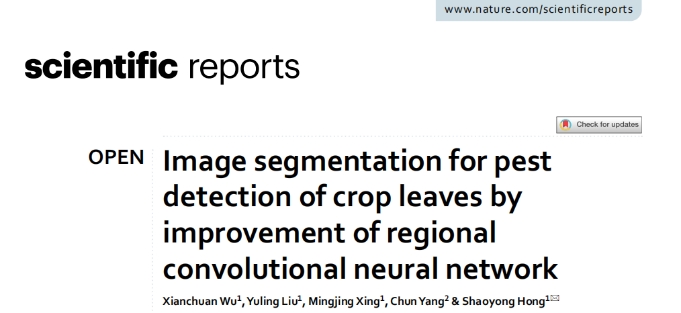 在现代农业中,病虫害的早期识别对于确保作物健康和提升产量具有重要意义。我校洪绍勇副教授带领的研究团队在《Scientific Reports》上发表了一项创新性研究成果,该论文的第一作者是吴宪传老师。论文标题为“Image segmentation for pest detection of crop leaves by improvement of regional convolutional neural network”,该期刊是SCIE收录的Q1区期刊,属于中科院二区。《Scientific Reports》是Nature集团于2011年创立的开放获取期刊,发表自然科学、心理学、医学和工程学等多个学科的原创研究。