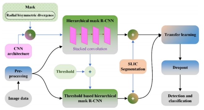 本文针对现有病虫害检测技术的局限性,如效率低下、存储需求高和精确度有限,提出了一种基于深度学习的图像分割技术。研究团队设计了一种结合径向双对称发散(RBD)方法的区域卷积神经网络(R-CNN)架构(见图1),通过层次掩模(HM)技术增强了图像分割的效率,并引入了基于阈值的层次掩模(TbHM)来调整容错机制,从而提高了模型的鲁棒性。