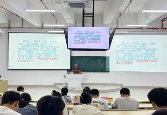 刘洪生教授生动有趣地给学生讲授庄子寓言的北冥有鱼、五石之瓠、无用之用、与惠施论鱼、庄子钓于濮水等寓言故事,深刻分析了庄子寓言故事中蕴涵的深厚的中华传统管理文化的高度智慧,面对的市场经济大潮带来的社会功利性和人工智能迅猛发展给人的内心带来的巨大冲击,给管理学带来了前所未有的机遇和挑战,庄子以自我管理为疏导和调控机制的生命哲学,从无序到有序再到自序的自然管理理念以及形而上的本体论认知管理设想。以其深邃的智慧和独特的视角,恰似给当今功利的社会和躁动的人心从中国传统管理文化的智慧中开出一剂良药,最终达致“管”而“有理”, “管”而“有道”, “管”而“有情”。