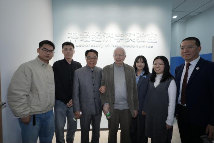 2024年11月21日,诺贝尔化学奖得主、超分子化学奠基人之一、法国科学院院士、中国科学院外籍院士、美国国家科学院外籍院士、我校荣誉校长Jean-Marie Lehn教授,在时隔五年后再访华商。为我校全体师生开展了《通向复杂物质的阶梯:化学!》专题讲座后,在我校校长陈新滋院士、副校长吕峻闽教授的陪同下,Jean-Marie Lehn 教授参观了神经经济学重点实验室。