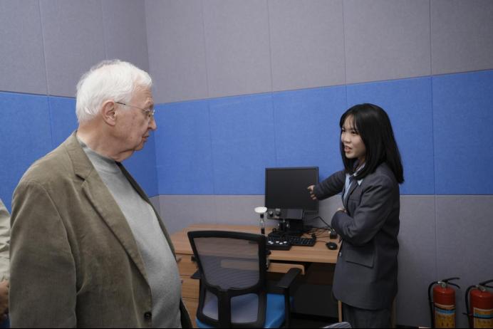 实验室的林佳丽、江小倩和刘广涛三位科研教师,向Lehn 教授介绍脑电仪、经颅磁刺激、生理压力评估系统以及眼动仪等设备。Lehn 教授对实验室的建设表示赞许,并为实验室的进一步发展提供了具有方向性的建议和鼓励。