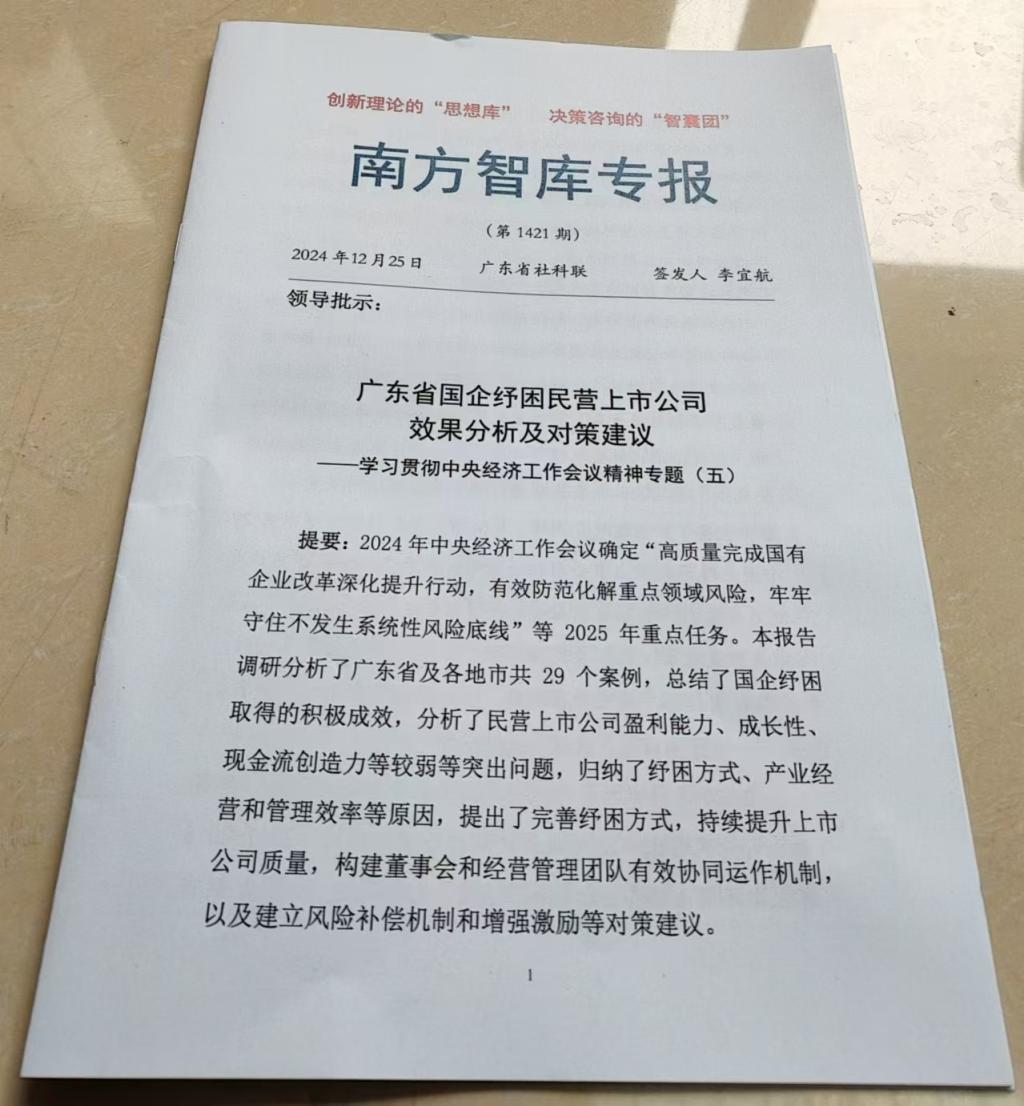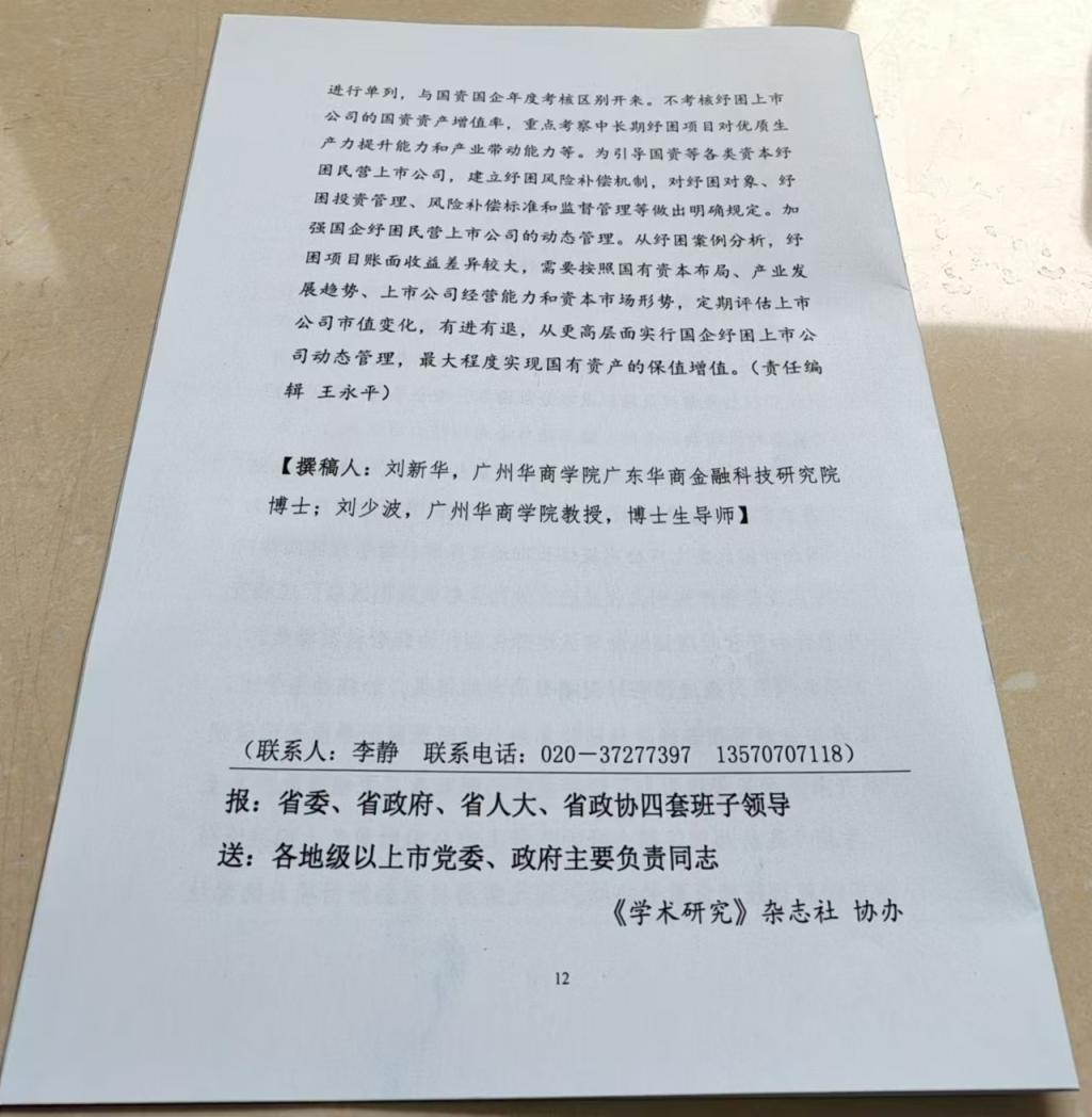 2024年12月25日,由我校广东省普通高校特色新型智库——广东华商金融科技研究院刘新华博士、刘少波教授合作撰写的决策咨询报告《广东省国企纾困民企上市公司效果分析及对策建议》,刊发在《南方智库专报》第1421期。这是我校老师的决策咨询研究成果首次被该刊录用刊发。