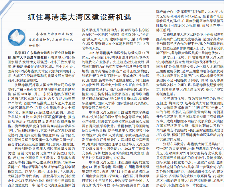 2025年3月2日,《经济日报》智库版刊发广东省普通高校特色新型智库“广东华商金融科技研究院”陈章喜教授撰写的文章《抓住粤港澳大湾区建设新机遇》。这是《经济日报》首次刊发我校教授的决策咨询文章。