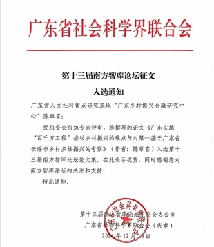 最近,广东乡村振兴金融研究中心陈章喜教授撰写的研究报告《广东实施“百千万工程”推动乡村振兴的难点与对策——基于广东省云浮市乡村多维振兴的考察》入选第十三届南方智库论坛征文论文集。该报告在对广东省乡村振兴典型区域云浮市乡村振兴的产业、组织、文化、生态等进行全方位和系统调研分析基础上,就广东乡村振兴中的难点问题进行了探讨并提出了若干政策建议。