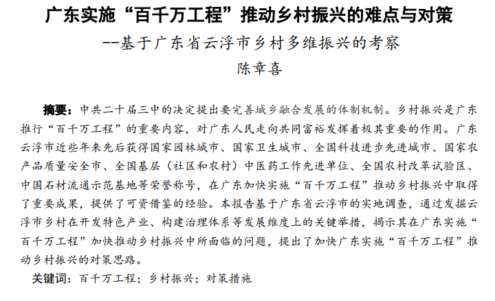 中共广东省委十三届二次全会强调,要突出县域振兴,高水平谋划推进城乡区域协调发展,实施“百县千镇万村高质量发展工程”,推动城乡区域协调发展向着更高水平和更高质量方向迈进。为此,我中心研究人员积极开展调研活动和撰写研究报告。陈章喜教授撰写的这篇研究报告,入选南方智库论坛论文集,说明该文对推动广东省“百县千镇万村高质量发展工程”的深入实施有较好参考价值。