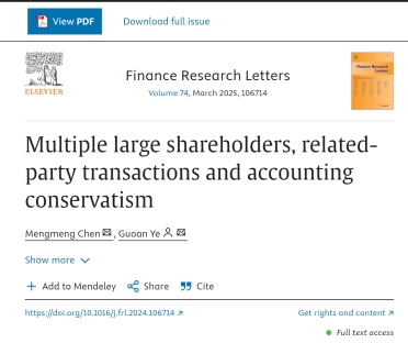 会计学院陈蒙梦副教授团队的论文《Multiple large shareholders, related-party transactions andaccounting conservatism》在《Finance Research Letters》2025年第74卷(Volume 74, March 2025)发表。Finance Research Letters是一本以Business和Finance综合研究为特色的国际期刊。该刊由Elsevier出版商创刊于2004年,为JCRQ1期刊,中科院TOP 2区,澳大利亚商学院院长理事会(ABDC)评级A类期刊,期刊影响因子为7.4。