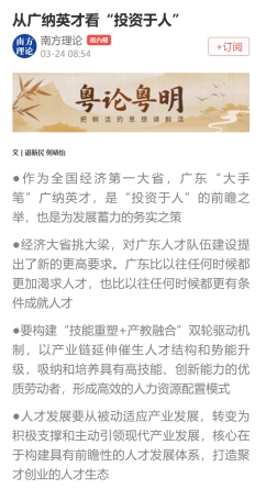 聚焦广东省实施“百万英才汇南粤”的行动计划,粤港澳大湾区研究院在《南方日报(理论版)》发表的《从广纳英才看 “投资于人”》一文,系统阐释广东构建人才发展体系、打造聚才创业的人才生态的前瞻性与实践价值,受到媒体与政策界高度认可,彰显了高校智库 “咨政启民” 的社会价值。