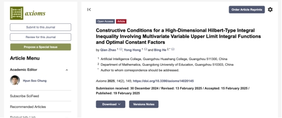 人工智能学院赵茜老师论文“Constructive Conditions for a High-Dimensional Hilbert-Type Integral Inequality Involving Multivariate Variable Upper Limit Integral Functions and Optimal Constant Factors”在《axioms》2025年2月发表。《axioms》是一本由MDPI出版社于2012年创刊发行的,在应用数学与跨学科研究中具有较高认可度的知名期刊,分区为JCR Q1,中科院3区,影响因子为1.9。