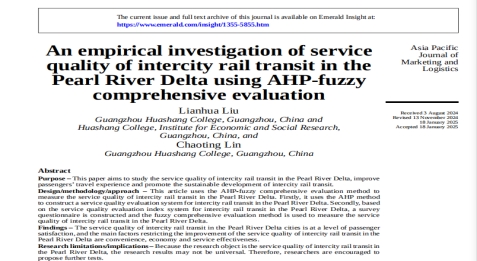 其与2019级学生林超婷合作的于2025年发表的SSCIJCR Q2论文《An Empirical Investigation of Service Quality of Intercity Rail Transit in the Pearl River Delta Using AHP Fuzzy Comprehensive Evaluation》,采用层次分析法与模糊综合评价模型,评估珠三角城际铁路服务质量,填补了区域交通服务质量量化研究的空白,为湾区交通规划提供了决策支持。