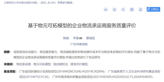 陈岫副教授的师生共研团队经过师生的共同努力,其与2017级学生蔡城龙合作,于2022年在科技核心期刊《云南师范大学学报(自然科学版)》发表《基于物元可拓模型的企业物流承运商服务质量评价》论文。文章选取物流综合能力、物流服务能力、物流辅助服务和物流操作成本作为物流承运商的评价指标,构建了基于物元可拓模型的企业物流承运商服务质量评价模型,并通过实例进行了实证研究,为企业选择物流承运商提供借鉴。