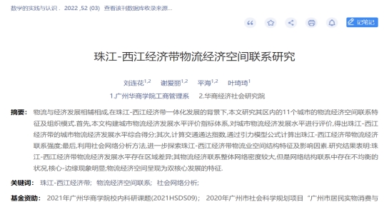 刘连花副教授师生共研团队取得了较大的成果,其与2017级学生叶琦琦,于2022年在科技核心期刊《数学的实践与认识》发表《珠江-西江经济带物流经济空间联系研究》,文章研究珠江-西江经济带区内的11个城市的物流经济空间联系特征及组织模式。研究结果表明,珠江-西江经济带物流经济发展水平存在区域差异;其物流经济联系整体网络密度较大,但是网络结构联系中存在不均衡的状况,核心-边缘现象明显;物流经济空间呈现为双核心发展的特征,文章为促进珠江-西江经济带物流一体化发展提供了科学依据。