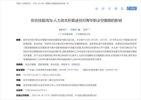 2025年4月,粤港澳大湾区研究院谌新民教授、何靖怡老师、李萍教授(客座教授)共同撰写的论文“弥合技能鸿沟:人力资本积累途径对青年职业空窗期的影响”在《中国人力资源开发》发表。《中国人力资源开发》创办于1984年,是国家发展和改革委员会主管、中国人力资源开发研究会主办的专业刊物,为国内人力资源专业领域内唯一的北大核心期刊,在我国人力资源开发领域、人力资源职业化建设的前沿具有十足权威与影响力。