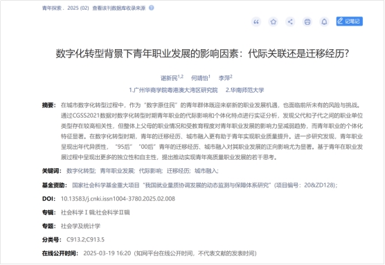 2025年3月,粤港澳大湾区研究院谌新民教授、何靖怡老师、李萍教授(客座教授)共同撰写的论文“数字化转型背景下青年职业发展的影响因素:代际关联还是迁移经历?”在《青年探索》发表。《青年探索》(双月刊)创刊于 1993 年,在共青团工作研究及青年研究领域一直享有盛誉,入选中文社会科学引文索引扩展版来源期刊、中国人文社会科学扩展期刊、中国科技核心期刊、RCCSE 中文核心学术期刊、人大复印报刊资料重要转载来源期刊,是全国观察青年、研究青年、反映青年、服务青年的权威窗口。