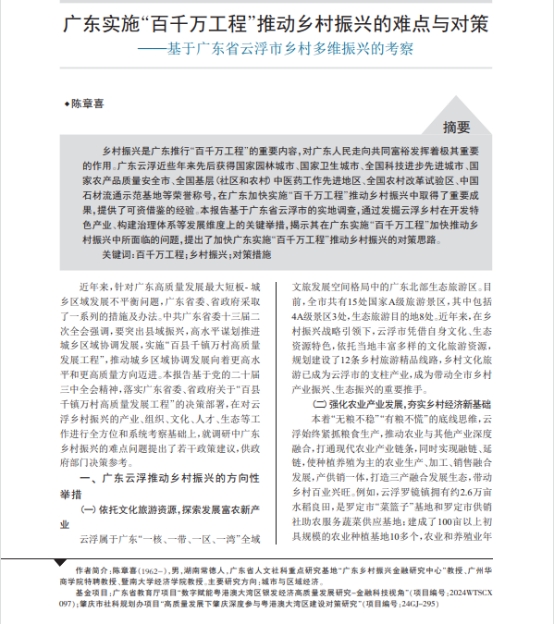 2025年4月28日,陈章喜教授前期提交给有关政府部门内部决策参考的“决策咨询报告”《广东实施“百千万工程”推动乡村振兴的难点与对策--基于广东省云浮市乡村多维振兴的考察》,被中共四川省委、四川省人民政府决策咨询委员会主办的专刊《决策咨询》期刊2025年第2期公开发表。