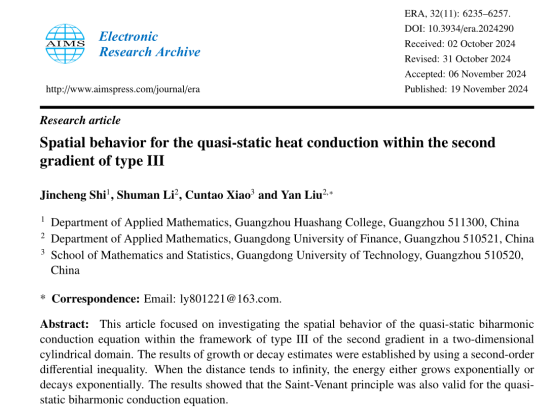 总体而言,该论文凭借严谨的数学分析,深入探究了准静态热传导方程在第二梯度理论下的空间行为,不仅得到了解的能量增长或衰减估计,还验证了Saint-Venant原理的适用性,研究成果还可以为工程和物理中的相关问题提供了理论支持,具有良好的学术价值和应用潜力。该成果为广州华商学院特色科研项目:热弹性力学方程组的定性性态研究(2024HSTS09)的阶段性成果。