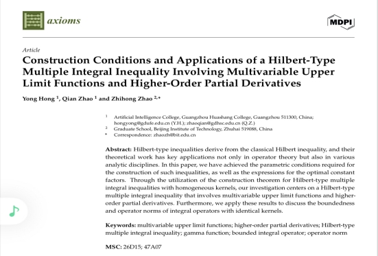 人工智能学院洪勇老师的论文“Construction Conditions and Applications of a Hilbert-Type Multiple Integral Inequality Involving Multivariable Upper Limit Functions and Higher-Order Partial Derivatives”在《axioms》于2025年5月发表。《Axioms》是一本由MDPI出版社于2012年创刊发行的,是应用数学与跨学科研究中具有较高认可度的知名期刊,分区为JCR Q1,中科院3区,影响因子为1.9。