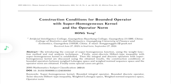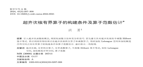 人工智能学院洪勇老师的论文“超齐次核有界算子的构建条件及算子范数估计”在《数学年刊》(A辑)于2024年6月发表,同时被选中译为英文稿“Construction Conditions for Bounded Operator with Super-Homogeneous Kernel and Estimation of The Operator Norm”在《Chinese Journal of Contemporary Mathematics》(《中国当代数学》,简称C辑,美国出版)上发表。