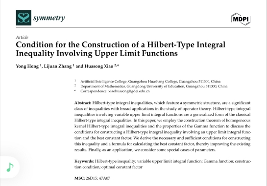 人工智能学院洪勇老师的论文“Condition for the Construction of a Hilbert-Type Integral Inequality Involving Upper Limit Functions”在《Symmetry》期刊于2024年12月发表,《Symmetry》是一本国际性、跨学科的学术期刊,由MDPI出版,创刊于2009年,主要发表数学、计算机科学和物理学等学科中与对称相关的高质量原创性论文,是具有较高影响力的期刊,影响因子2.2,被SCI等多个知名数据库收录,是JCR Q2和中科院3区期刊。