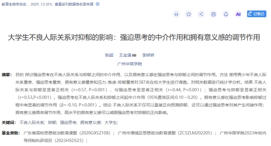 2025年3月,外国语学院辅导员张超老师以第一作者身份在《教育生物学杂志》发表了题为“大学生不良人际关系对抑郁的影响:强迫思考的中介作用和拥有意义感的调节作用”的论文。《教育生物学杂志》(Journal of Educational Biology)是2024年中国科技论文统计源期刊(CSTPCD),创刊于2013年,是由上海交通大学主管、上海交通大学医学院附属新华医院主办的我国第一本教育生物学学术性科技期刊,主要报道国内外教育生物学领域研究的最新成果、进展、经验和动态。