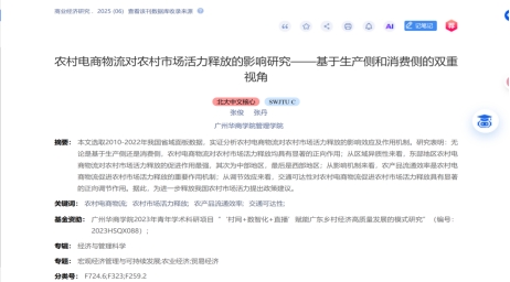 2025年6月,管理学院张俊老师以第一作者身份在《商业经济研究》发表题为“农村电商物流对农村市场活力释放的影响研究——基于生产侧和消费侧的双重视角”的论文。《商业经济研究》是《中文核心期刊要目总览》贸易经济类核心期刊,长期聚焦商贸流通、农村经济等领域研究,为政策制定与学术探索提供重要参考,在行业内具有较高的学术影响力与实践指导价值。