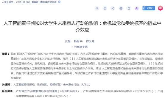 2025年3月,外国语学院辅导员张超老师以第一作者身份在《人类工效学》发表了题为“人工智能责任感知对大学生未来意志行动的影响:危机知觉和委婉标签的链式中介效应”的论文。《人类工效学》(Chinese Journal of Ergonomics)是2025年中国科技论文统计源期刊(CSTPCD),创刊于1995年,由中国人类工效学学会、安徽三联事故预防研究所主办,教育部主管的学术期刊。
