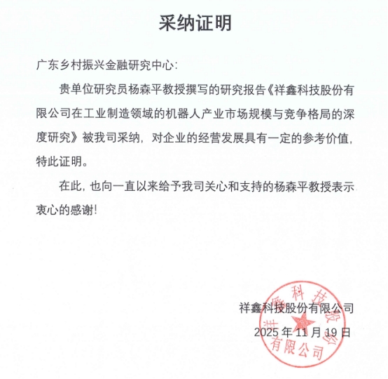 2025年11月,祥鑫科技股份有限公司正式采纳广东乡村振兴金融研究中心杨森平教授及其团队撰写的《祥鑫科技在工业制造领域的机器人产业市场规模与竞争格局的研究》咨询报告。该报告系统剖析了该公司自2024年以来在工业制造领域,尤其是新兴机器人业务方面的战略布局、市场前景与发展潜力。