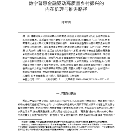 最近,广东华商金融科技研究院陈章喜教授以独立作者身份在《江苏行政学院学报》2025年第6期发表题为《数字普惠金融驱动高质量乡村振兴的内在机理与推进路径》的理论文章。文章认为,高质量乡村振兴能够补齐农村发展短板,深度解决“三农”问题,为全面建设社会主义现代化国家奠定坚实的基础,数字普惠金融作为高质量乡村振兴的驱动因素,通过技术创新和资源优化等多个渠道,从产业到宜居,从乡风到民生,从治理到融合,为高质量乡村振兴提供了强有力的支持。